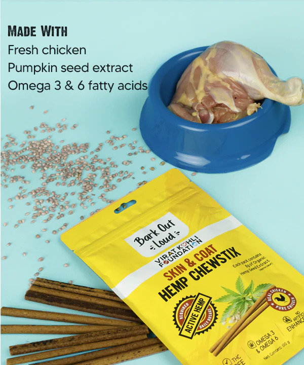 Bark Out Loud’s Hemp ChewStix is a perfect solution for maintaining your pet’s healthy skin and coat. The chews are highly palatable and power-packed with hemp seed oil and thus are full of omega 3, omega 6 fatty acids, hemp seed powder – rich source of of essential amino acids . The treats are also 100% THC free